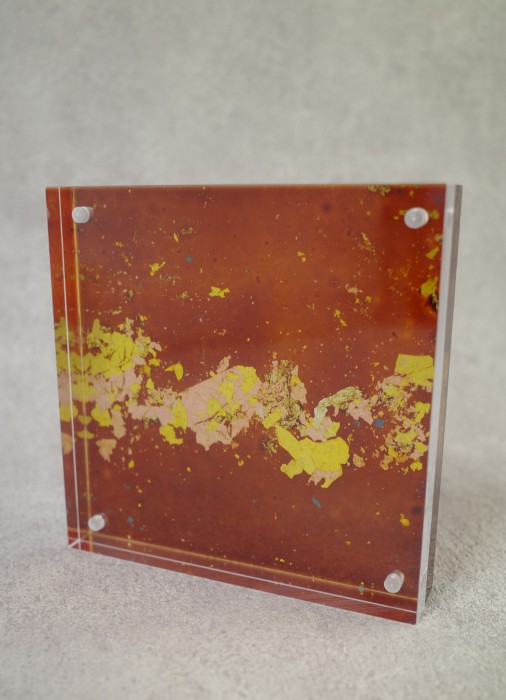 アクリルに漆自然紋を施し、もう一枚のアクリル板と挟むことで写真立てとなる商品です。